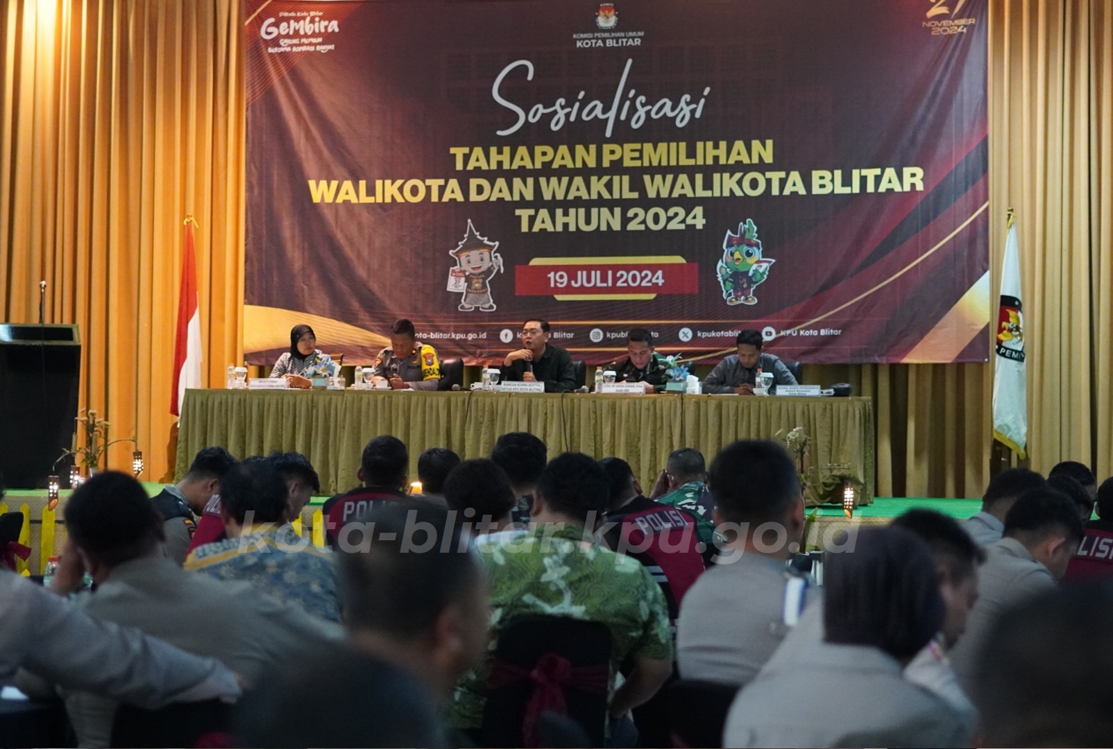 Kota Blitar, kota-blitar.kpu.go.id – Mewujudkan Pilkada yang demokratis dan berintegritas di Kota Blitar, tentu perlu adanya dukungan dan kerjasama antar pihak dalam penyelenggaraannya. Termasuk kondisifitas wilayah pada saat penyelenggaraan tahapan. Untuk itu KPU Kota Blitar melaksanakan sosialisasi tahapan Pilkada Serentak Tahun 2024 bersama anggota Polri dan TNI, Jum’at (19/07).