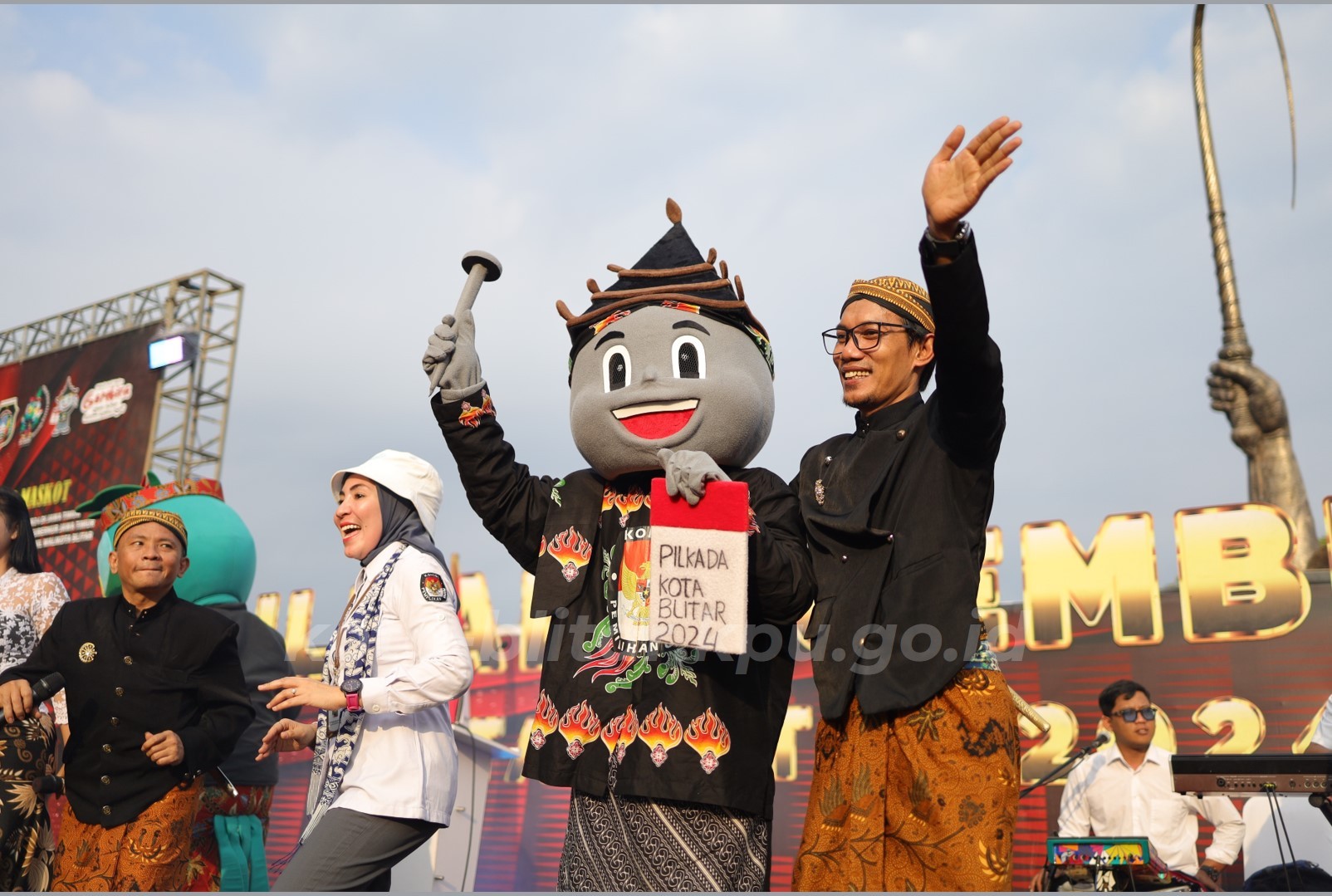 Kota Blitar, kota-blitar.kpu.go.id – Kirab Maskot Pilkada Serentak Tahun 2024 di Jawa Timur telah tiba di Kota Blitar, Senin (12/08). Rombongan kirab maskot Pilkada Serentak Tahun 2024 dari Tulungagung disambut langsung oleh KPU Kota Blitar di Taman Pecut, Jl. Kenanga Kota Blitar.