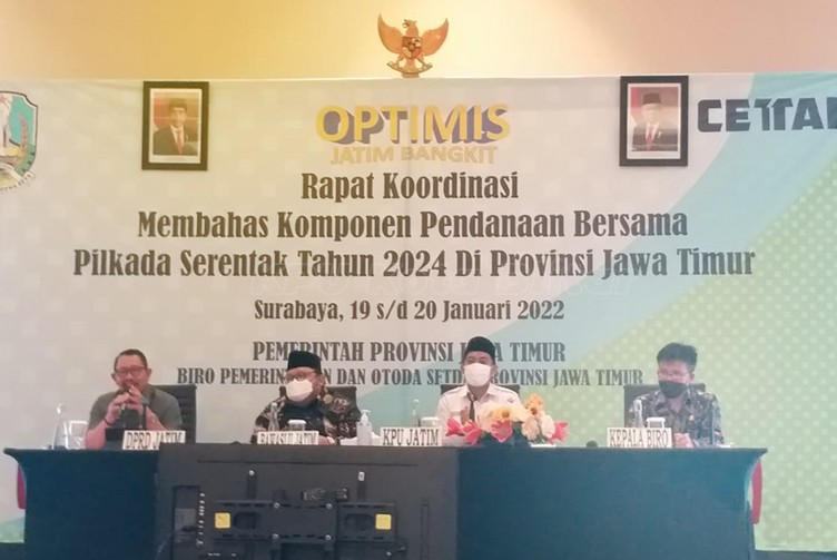Untuk itu Pemerintah Provinsi jawa Timur menggelar rapat koordinasi dengan membahas komponen pendanaan bersama pemilihan serentak tahun 2024 bersama Bapedda,BPKAD, Bakesbangpol, Kepala Biro Hukum Setda, KPU dan Bawaslu Provinsi Jawa Timur serta 38 KPU Bawaslu Kabupaten/Kota, Rabu (19/01). Kepala Biro Pemerintahan Provinsi Jawa Timur, Jempin Marbun mengungkapkan ada beberapa komponen pendanaan bersama yang telah disepakati oleh 38 kabupaten/ kota dan provinsi.