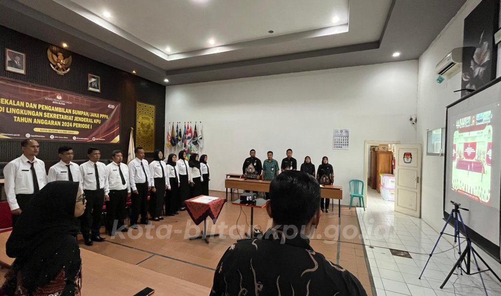 Kota Blitar, kota-blitar.kpu.go.id – Sejumlah 10 calon PPPK Tahun 2024 Periode I yang akan bertugas di Sekretariat KPU Kota Blitar melaksanakan pengambilan sumpah/janji PPPK, Jumat (24/5). Dilaksanakan secara daring, calon PPPK Tahun Anggaran 2024 Periode I dilantik oleh Sekretaris Jenderal KPU RI Bernard Dermawan Sutrisno .