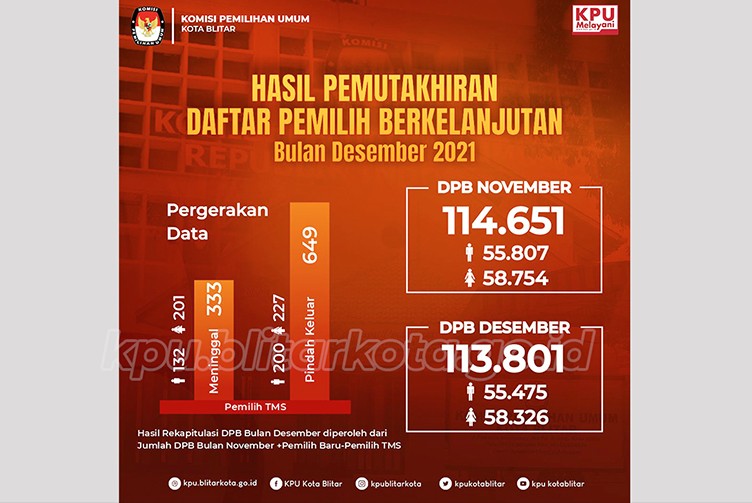 Komisi Pemilihan Umum Kota Blitar telah melakukan Rekapitulasi Daftar Pemilih Berkelanjutan bulan Desember tahun 2021 sebagai berikut.