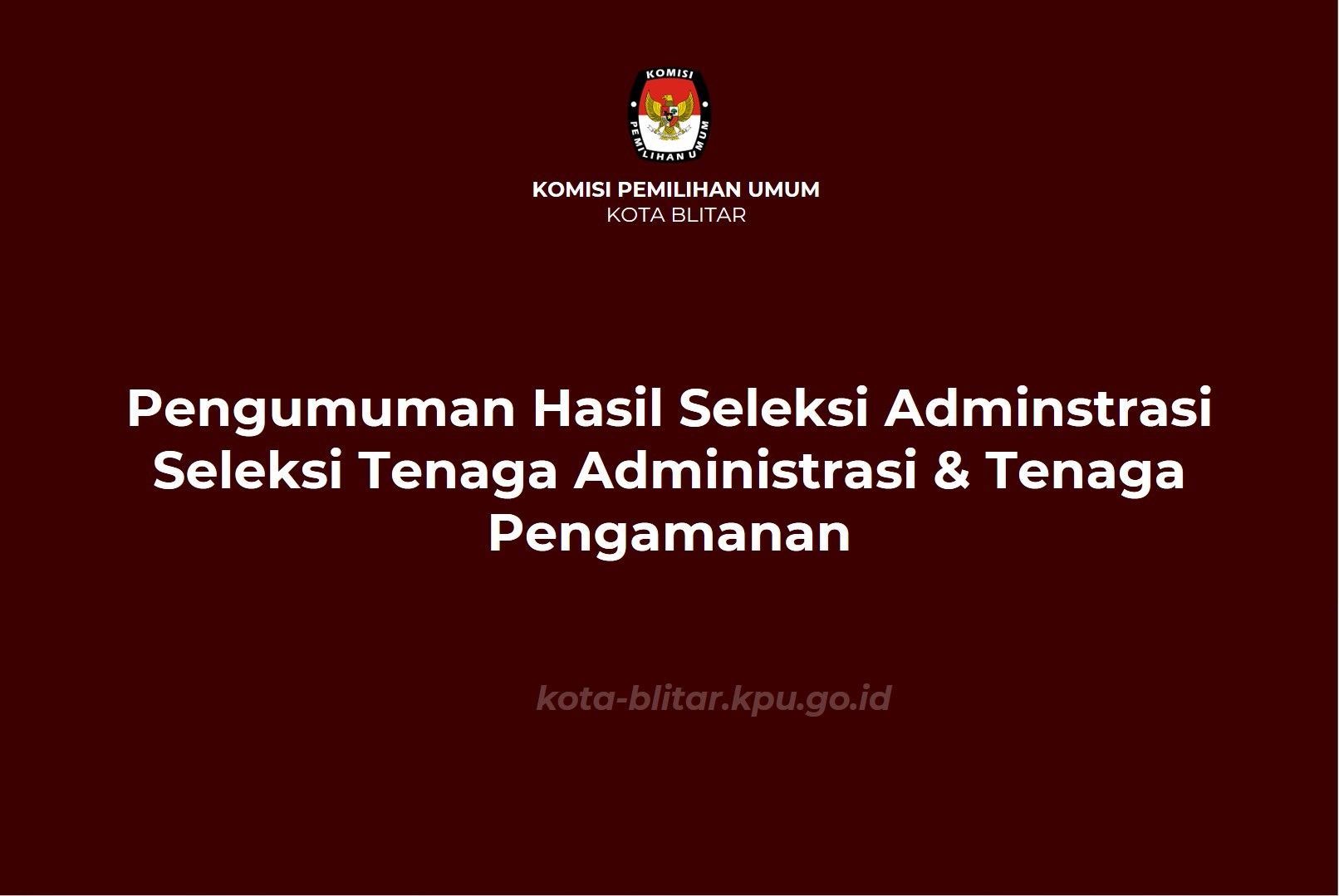 Kota Blitar, kota-blitar.kpu.go.id - Sekretariat KPU Kota Blitar mengumumkan peserta yang dinyatakan lulus seleksi administrasi dalam rangka seleksi Tenaga Administrasi Pejabat Komitmen dan Tenaga Pengamanan Tempat Penyimpanan Logistik Pemilihan Umum Tahun 2024. Adapun pengumuman dapat diunduh pada tautan berikut.