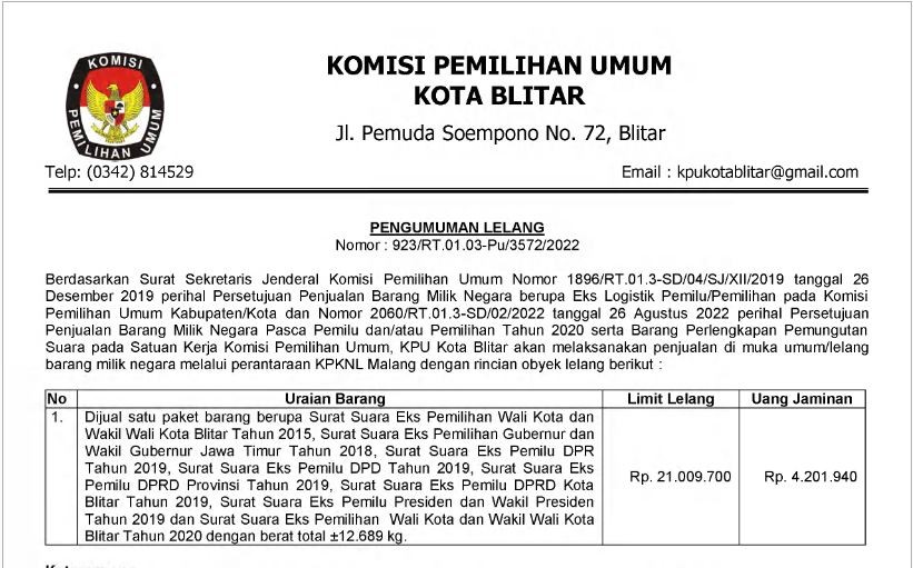 Blitar, kota-blitar.kpu.go.id - KPU Kota Blitar dengan Perantaraan Kantor Pelayanan Kekayaan Negara dan Lelang (KPNKL) Malang, akan melaksanakan penjualan di muka umum (lelang) terhadap objek lelang berupa Barang Milik Negara yaitu Surat Suara Eks Pemilihan Wali Kota dan Wakil Wali Kota Blitar Tahun 2015, Surat Suara Eks Pemilihan Gubernur dan Wakil Gubernur Jawa Timur Tahun 2018, Surat Suara Eks Pemilu DPR Tahun 2019, Surat Suara Eks Pemilu DPD Tahun 2019, Surat Suara Eks Pemilu DPRD Provinsi Tahun 2019, Surat Suara Eks DPRD Kota Blitar Tahun 2019, Surat Suara Eks Pemilu Presiden dan Wakil Presiden Tahun 2019 dan Surat Suara Eks Pemilihan Wali Kota dan Wakil Wali Kota Blitar Tahun 2020.