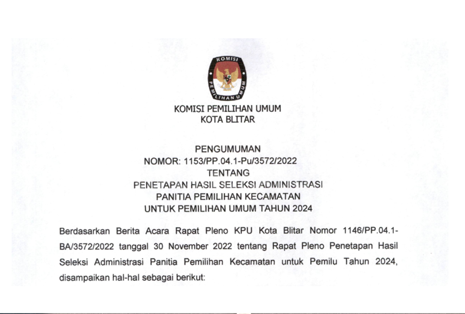 Pengumuman Penetapan Hasil Seleksi Administrasi PPK Pemilu Tahun 2024