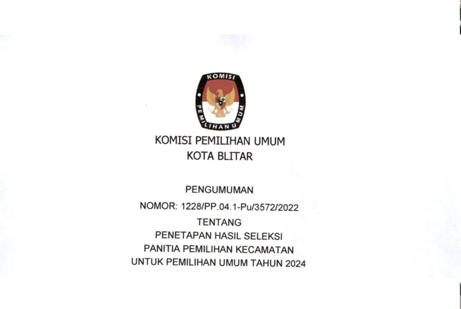Kota Blitar, kota-blitar.kpu.go.id - Berdasarkan berita acara rapat pleno KPU Kota Blitar Nomor 1224/PP.04.1-BA/3572/2022 pada tanggal 13 Desember 2022, KPU Kota Blitar mengumumkan dan menetapkan daftar nama calon anggota PPK peringkat 1-5 ditetapkan sebagai calon Anggota Panitia Pemilihan Kecamatan terpilih dan peringkat 6-10 sebagai calon Pengganti Antarwaktu Anggota Panitia Pemilihan Kecamatan untuk Pemilu Tahun 2024. Adapun daftar lampiran dapat diunduh pada link berikut.
