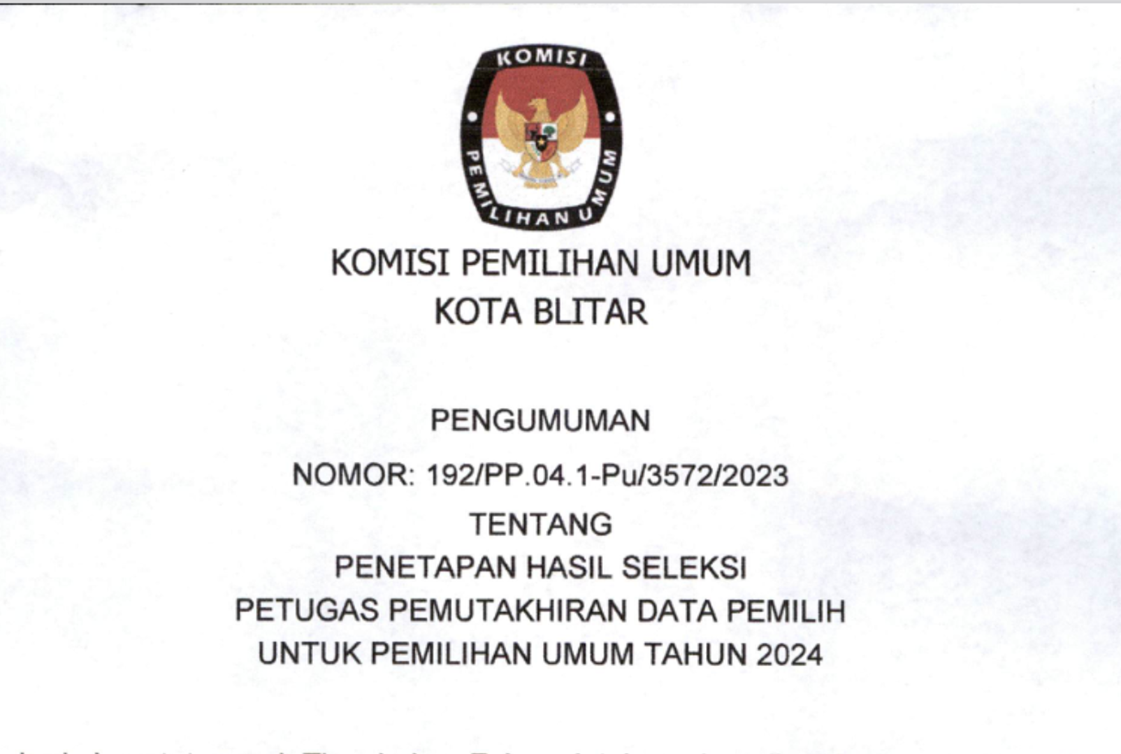 Pengumuman Penetapan Hasil Seleksi Petugas Pemutakhiran Data Pemilih Untuk Pemilihan Umum Tahun 2024