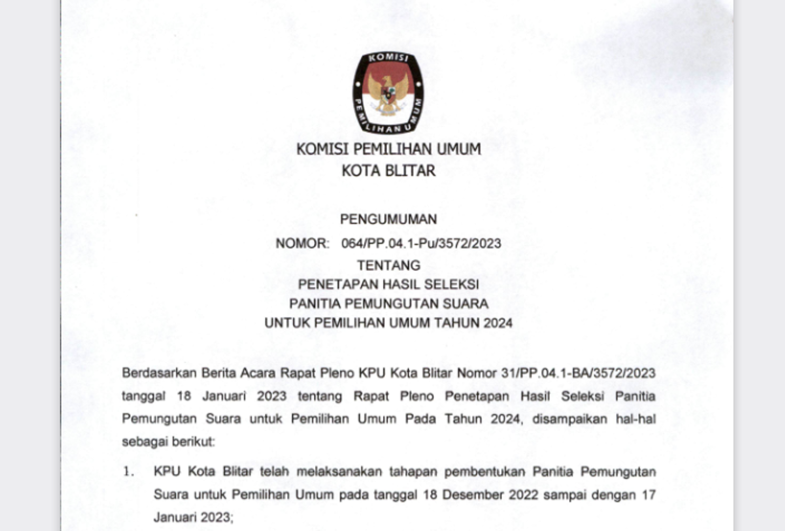 Kota Blitar, kota-blitar.kpu.go.id - Berdasarkan berita acara rapat pleno KPU Kota Blitar Nomor 31/PP.04.1-BA/3572/2023 tanggal 18 Januari 2023, KPU Kota Blitar mengumumkan penetapan calon anggota PPS untuk Pemilihan Umum Tahun 2024.
