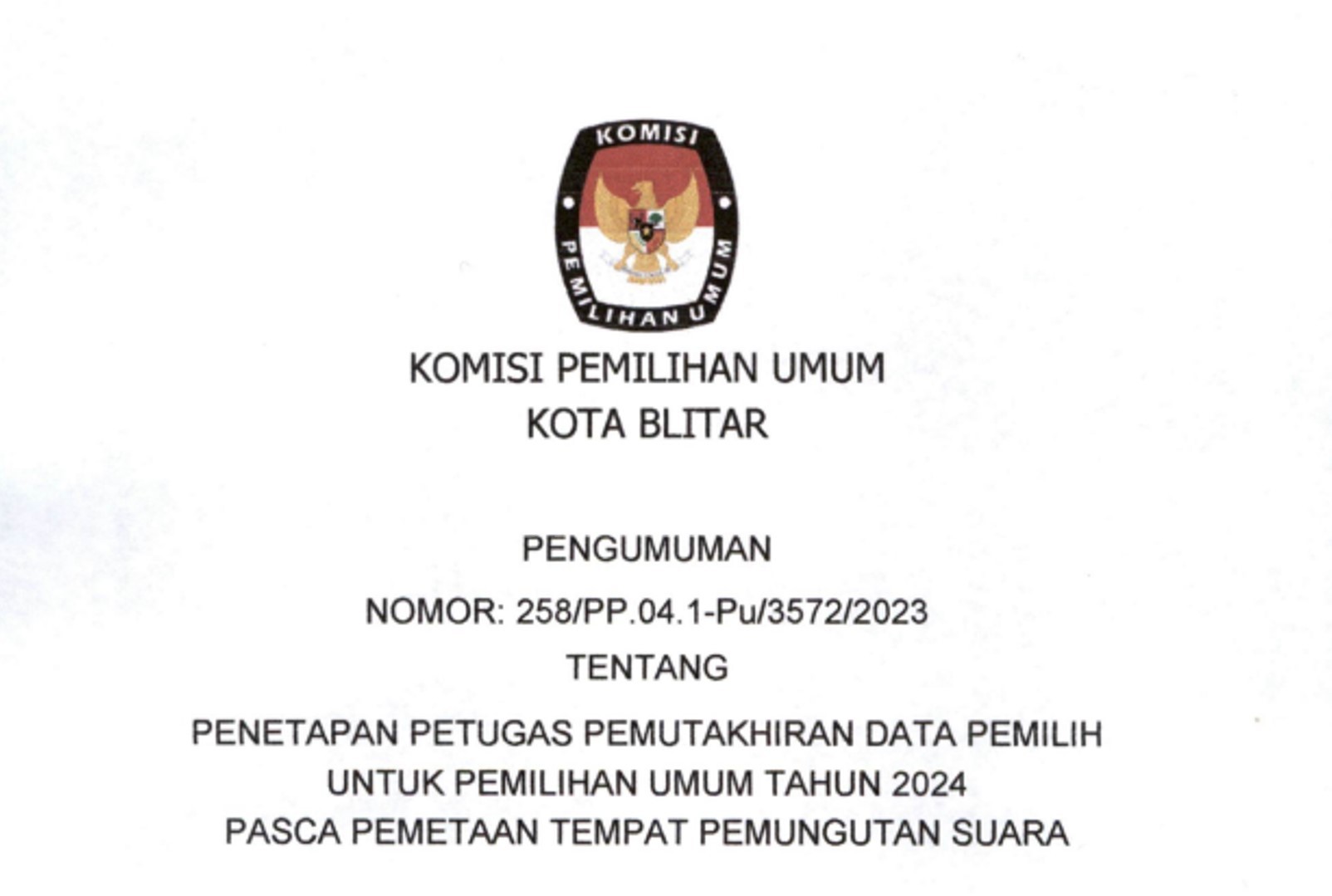 Kota Blitar, kota-blitar.kpu.go.id - Komisi Pemilihan Umum Kota Blitar mengumumkan Penetapan hasil Seleksi Petugas Pemutakhiran Data Pemilih untuk Pemilihan Umum Tahun 2024 pasca pemetaan Tempat Pemungutan Suara.