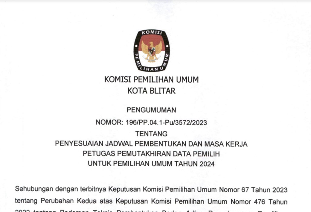 Kota Blitar, kota-blitar.kpu.go.id – Sehubungan dengan terbitnya Keputusan Komisi Pemilihan Umum Nomor 67 Tahun 2023 tetang Perubahan Kedua atas Keputusan Komisi Pemilihan Umum Nomor 476 Tahun 2022 tentang Pedomna Teknis Pembentukan Badan Ad Hoc Penyelenggara Pemilihan Umum dan Pemilihan Gubernur dan Wakil Gubernur, Bupati dan Wakil Bupati, dan Walikota dan Wakil Walikota, serta Surat Dinas Komisi Pemilihan Umum Nomor 145/PP.04-SD/04/2023 tanggal 4 Februari 2023, KPU Kota Blitar mengumumkan penyesuaian jadwal pembentukan dan masa kerja petugas pemutakhiran data pemilih (PANTARLIH) untuk Pemilu Tahun 2024. Pengumuman dapat diunduh pada link berikut.
