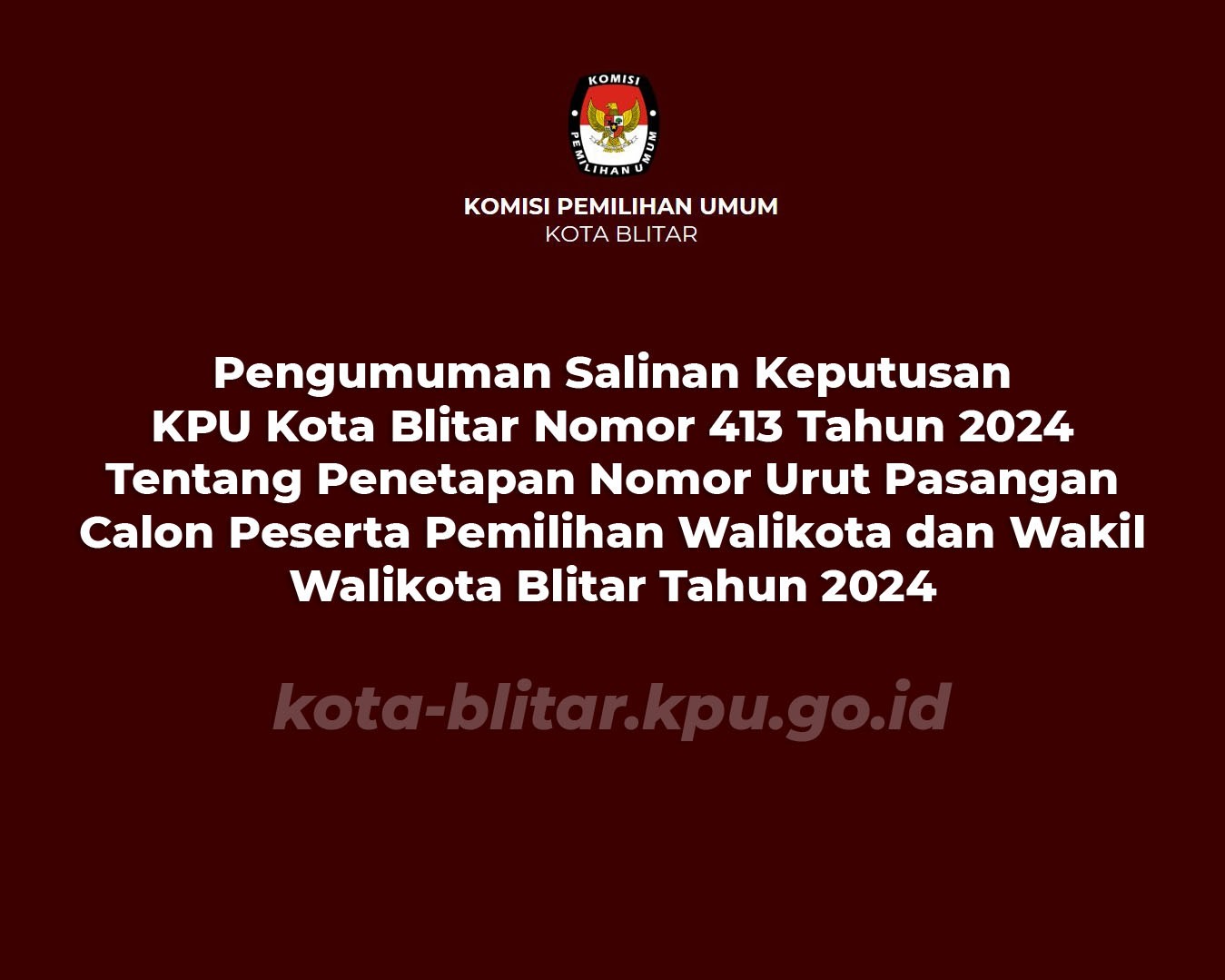 Pengumuman Salinan Keputusan KPU Kota Blitar Nomor 413 Tahun 2024 Tentang Penetapan Nomor Urut Pasangan Calon Peserta Pemilihan Walikota dan Wakil Walikota Blitar Tahun 2024