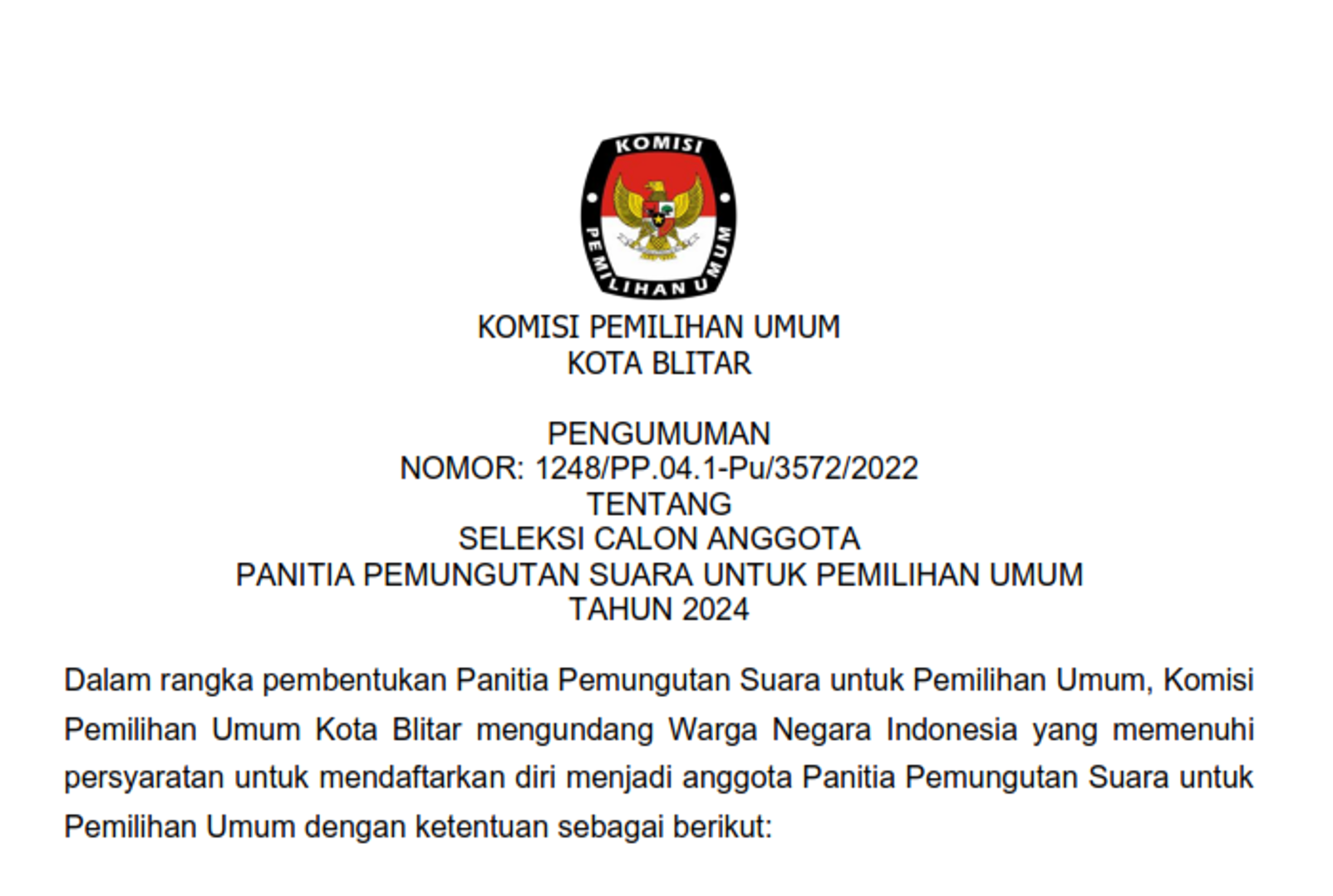 Kota Blitar, kota-blitar.kpu.go.id - Pengumuman Seleksi Calon Anggota Panitia Pemungutan Suara (PPS) untuk Pemilihan Umum Tahun 2024. Berikut disampaikan Pengumuman, Surat Pendaftaran, Surat Pernyataan, dan Daftar Riwayat Hidup
