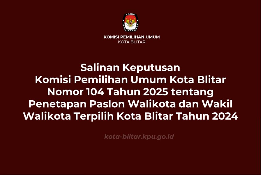 Salinan Keputusan Komisi Pemilihan Umum Kota Blitar Nomor 104 Tahun 2025 tentang Penetapan Paslon Walikota dan Wakil Walikota Terpilih Kota Blitar Tahun 2024