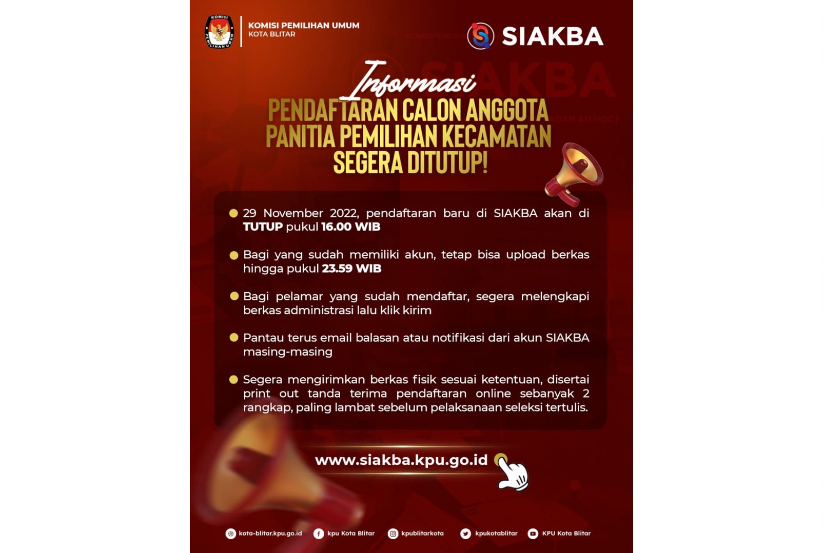 Divisi Sosdiklih, Parmas, dan SDM KPU Kota Blitar tersebut menambahkan bagi pelamar yang sudah mendaftar, ia berharap untuk segera melengkapi berkas administrasi dan cek notifikasi email. Karena admin SIAKBA nantinya akan mengirimkan informasi terkait kelengkapan administrasi yang sudah di unggah oleh pendaftar.