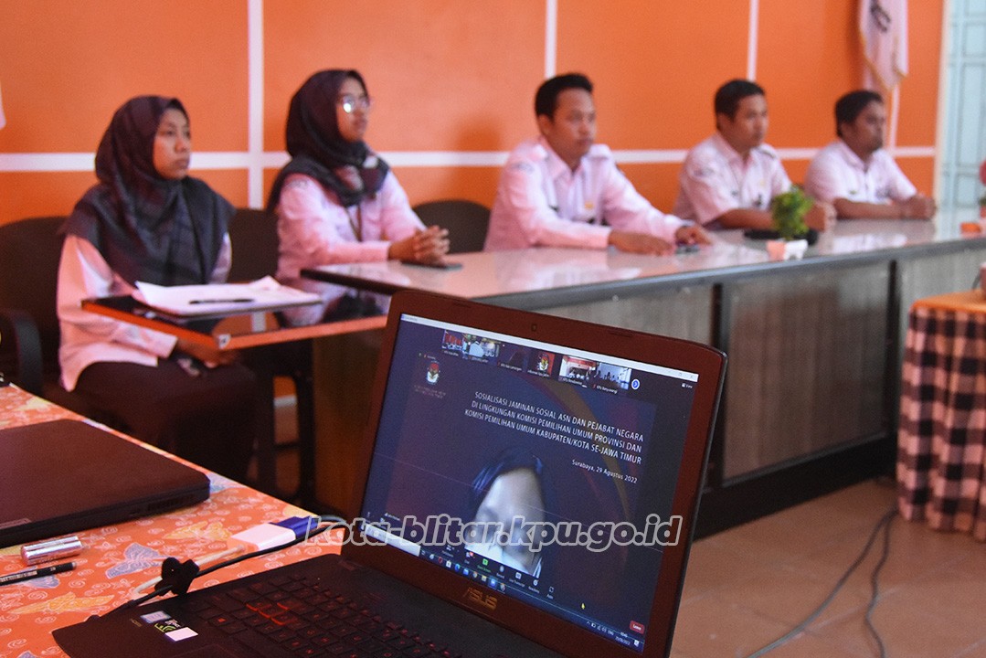 Blitar, kota-blitar.kpu.go.id – Senin (29/08), Komisioner, Sekretaris, Kasubbag beserta staff ASN mengikuti Sosialisasi Jaminan Sosial bagi Aparatur Sipil Negara (ASN) dan Penyelenggara Negara di Lingkungan Sekretariat KPU Jatim dan Kabupaten/Kota se-Jawa Timur. Menghadirkan narasumber PT. Taspen kegiatan ini diikuti secara daring di Aula KPU Kota Blitar.