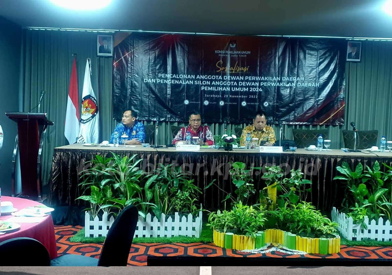 Surabaya, kota-blitar.kpu.go.id – Komisi Pemilihan Umum Provinsi Jawa Timur (KPU Jatim) menggelar Sosialisasi Pencalonan Anggota Dewan Perwakilan Daerah (DPD) dan Pengenalan Sistem Informasi Pencalonan (SILON) Anggota DPD Pemilihan Umum Tahun 2024 (Pemilu 2024) pada Selasa, 29 November 2022, di Hotel Aria Centra, Jalan Taman AIS Nasution nomor 37, Surabaya.